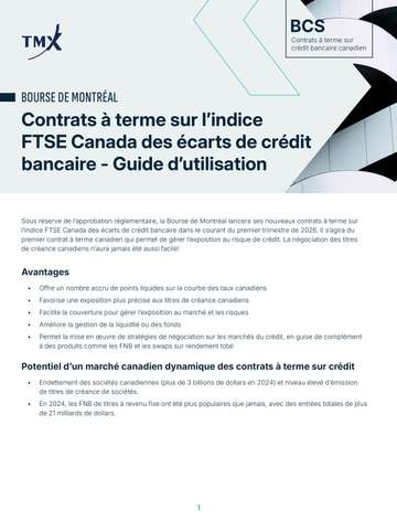 Avec plus de 3 billions de dollars canadiens de titres de créance de sociétés en circulation, et en raison de la popularité sans précédent des FNB, dont les entrées ont dépassé les 21 milliards de dollars canadiens en 2024, les marchés du crédit canadiens prennent de l’ampleur et gagnent en sophistication. Pour répondre aux besoins changeants des participants au marché, la Bourse de Montréal lancera le 8 avril 2026 un dérivé de crédit unique en son genre : le contrat à terme sur l’indice FTSE Canada des écarts de crédit bancaire (pour faire court, le BCS).