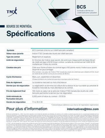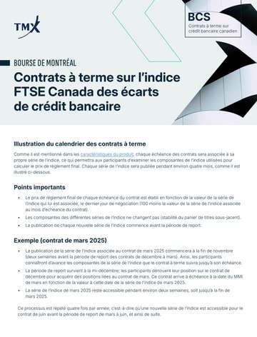 Fondé sur l'indice FTSE Canada des écarts de crédit bancaire*, qui isole la composante écart créditeur d’un portefeuille d’obligations de banques canadiennes, ce nouveau contrat offrira une exposition transparente, souple et directe au risque de crédit du secteur financier canadien et viendra étoffer votre trousse d’outils de gestion des risques de crédit et des risques associés au portefeuille.
